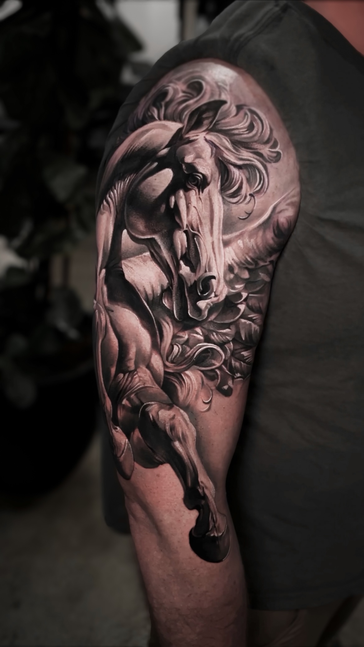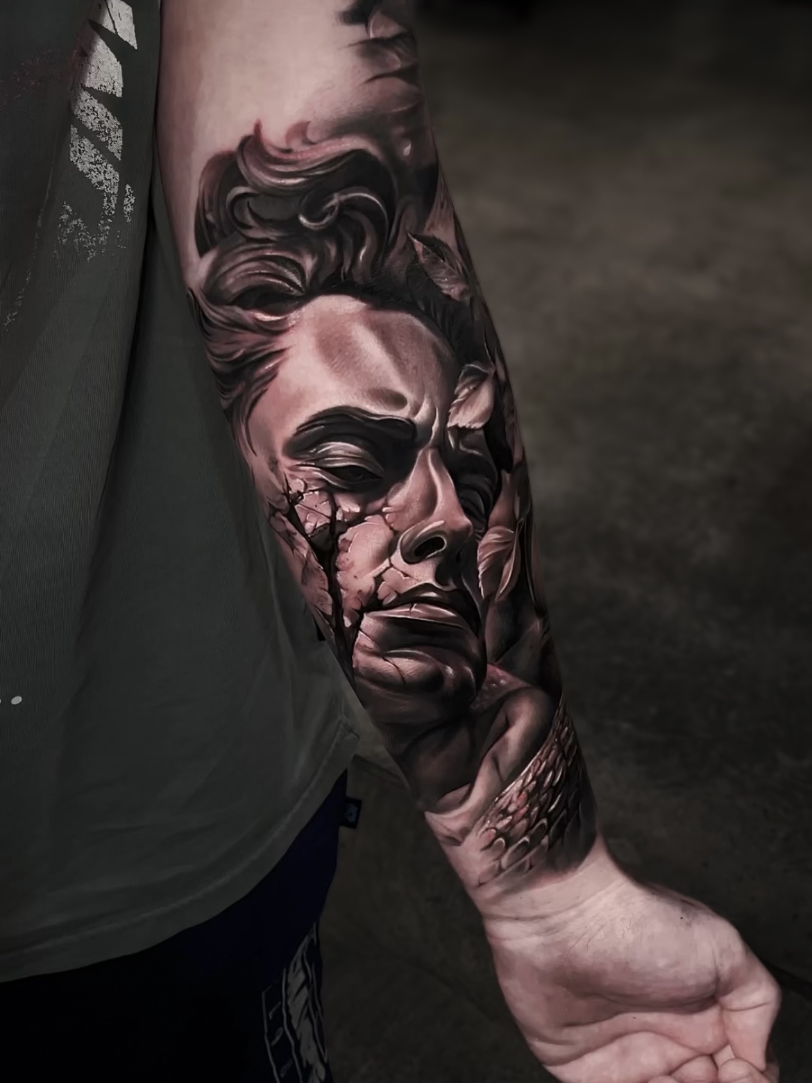 I focus on creating custom black & grey tattoos that are more than just visually striking – they’re built with intention, depth, and strong composition. I’m especially drawn to realism work inspired by mythology, philosophy, film, and history – subjects that explore the deeper meaning behind an idea or image.
